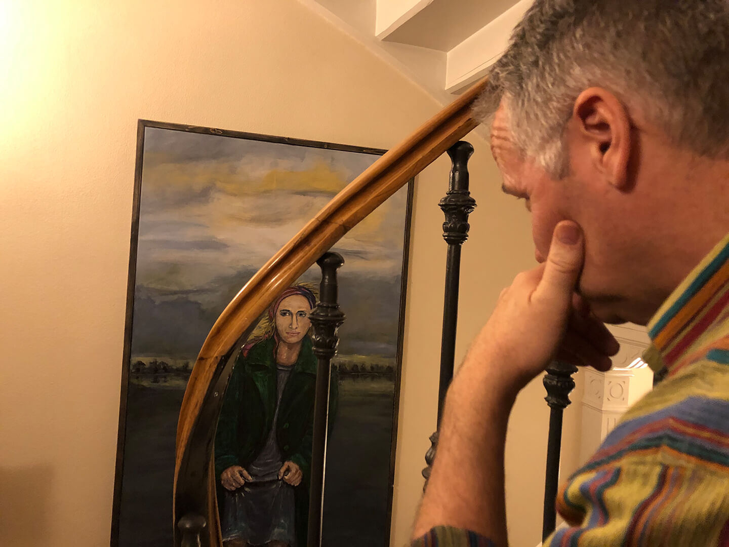 Gründerzeitvilla mit wunderschönem originalem Parkett sind dezent mit alten Biedermeiermöbeln ausgestattet, sie strahlen eine beeindruckende Ruhe aus und stehen in einer harmonischen Beziehung zu meinen abstrakten Bildern.