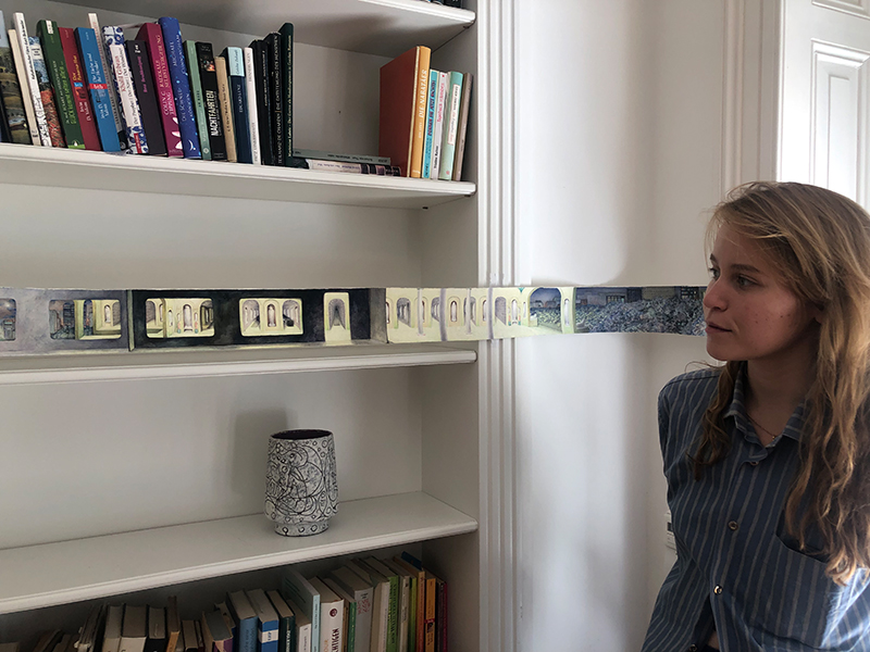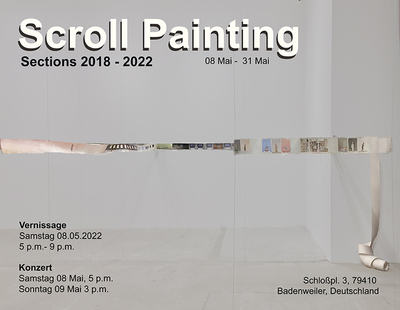 Nach einer längeren „Corona-Pause“ eröffneten wir am 8. Mai eine sehr besondere Ausstellung von Suvi Karjalainen, geboren 1996 in Finnland. Sie schloss ihr Fine Arts Studium 2018 an der Parsons New School in New York ab und sie lebt und arbeitet zur Zeit in Jakarta.Sie zeigte ihr 45 m langes und nur 10 cm Höhe messendes Werk, „Scroll Painting“ ein Rollbild, mit Aquarellfarben und Pigmenten auf Aquarellpapier gemalt mit dem Titel: „Moving Forward, I Saw Moments of Beauty“. Vergleichbar einem Tagebuch dokumentierte sie seit 2017 Begebenheiten aus ihrem Leben, Träume und Impressionen - und sie malt weiter daran… und wenn sie 97 Jahre alt würde und mit gleicher Regelmäßigkeit weitermalen würde wäre das Rollbild am Ende einen Kilometer lang. Die Rollzeichnung begann im Vorraum und verlief entlang der Wände, Fenster überkreuzend, durch Bücherregale verlaufend durch den großen Ausstellungsraum…Die hochfeinen tief atmosphärischen Zeichnungen nahmen den Betrachter mit auf eine Reise durch Raum und Zeit, Realität und Phantasie ließen sich oft nicht unterscheiden. Mal schaute man mit ihr auf feinste Details, dann entfernte man sich mit ihr immer weiter, immer weiter…. Erst Räume, dann Häuser, Städte, Landschaften verloren sich im Verlauf in der Weite des Weltraums… Neben den nachfolgenden Fotos der Ausstellung kann ihr Scroll Painting auch im internet angeschaut werden: scrollpainting.org. Weitere Werke der Künstlerin finden sich auf der website: suvikarjalainen.com, ihr Kontakt: suvi.k.art@gmail.com
